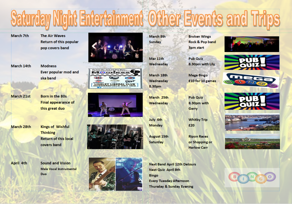 Throughout the year we run a number of trips from the club for our members and their guests. These trips have varied each year but we usually have a racing trip, a shopping trip (near Christmas) a theatre trip, trips to the dog racing and our annual trip to Whitby. All trips need to be paid for, but the club runs them at cost only so the price is always cheap. We use local reliable coach firms with air conditioned coaches with on board facilities.